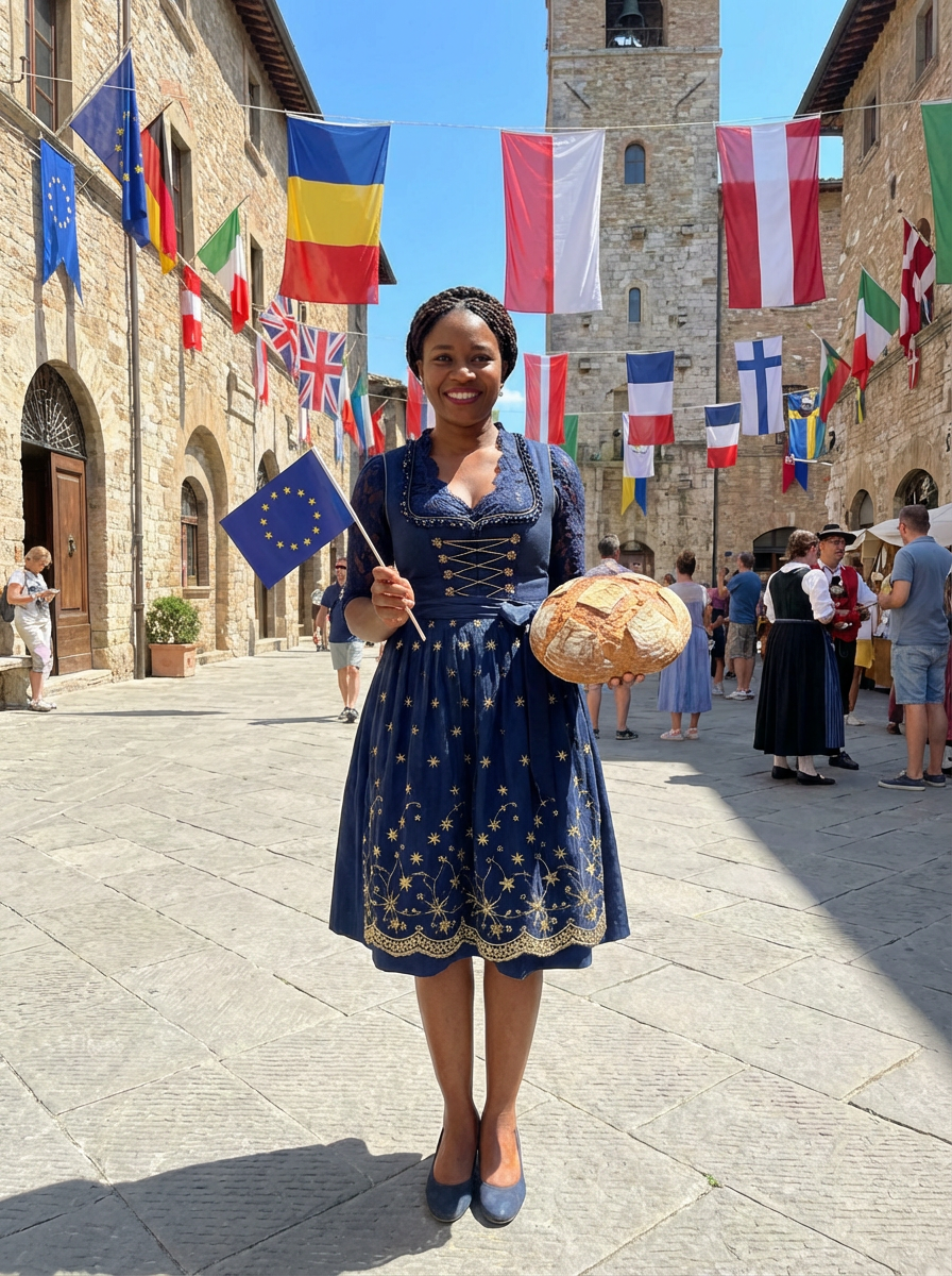model in traditional European festival attire, elegant dirndl in blue with gold star embroidery , holding a small European flag and traditional bread, standing proudly in a medieval town square decorated with flags of all European nations.