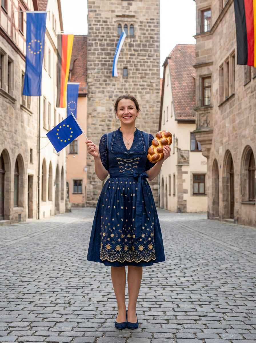 model in traditional European festival attire, elegant dirndl in blue with gold star embroidery , holding a small European flag and traditional bread, standing proudly in a medieval town square decorated with flags of all European nations.