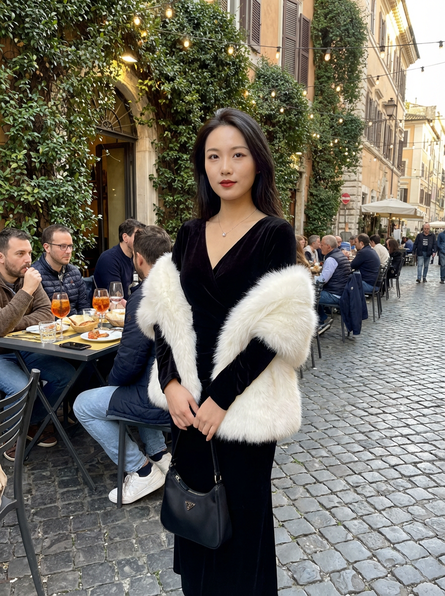 model in Trastevere neighborhood, charming cobblestone streets, ivy-covered walls, aperitivo scene