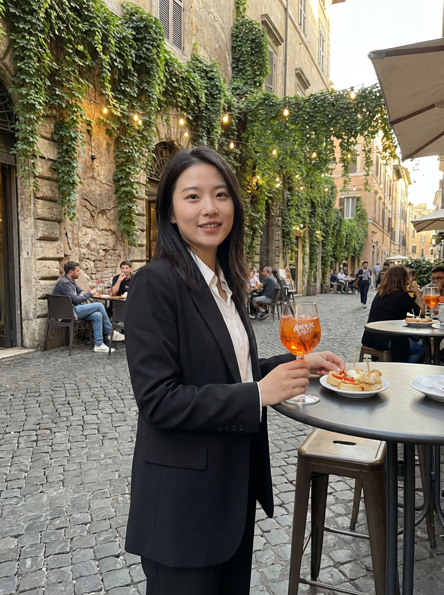 model in Trastevere neighborhood, charming cobblestone streets, ivy-covered walls, aperitivo scene