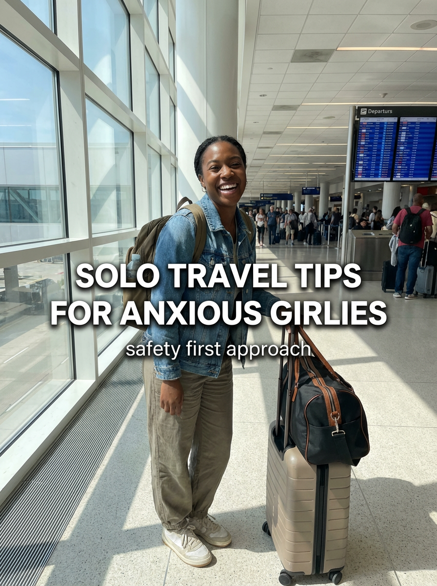model in travel outfit at airport or train station, luggage nearby, excited expression, natural lighting. TikTok text overlay: "solo travel tips for anxious girlies" smaller text: "(safety first approach)" , do not show tiktok interface