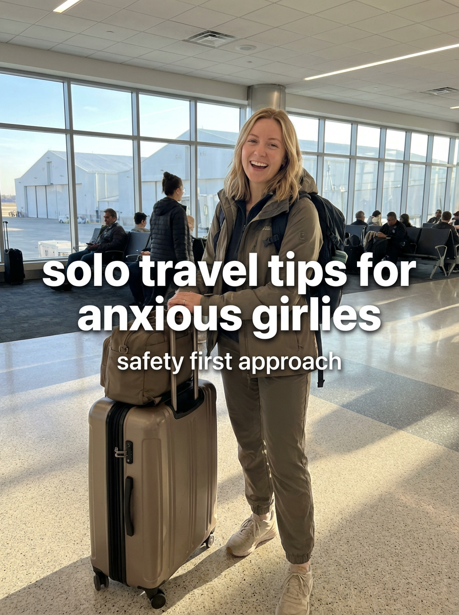 model in travel outfit at airport or train station, luggage nearby, excited expression, natural lighting. TikTok text overlay: "solo travel tips for anxious girlies" smaller text: "(safety first approach)" , do not show tiktok interface