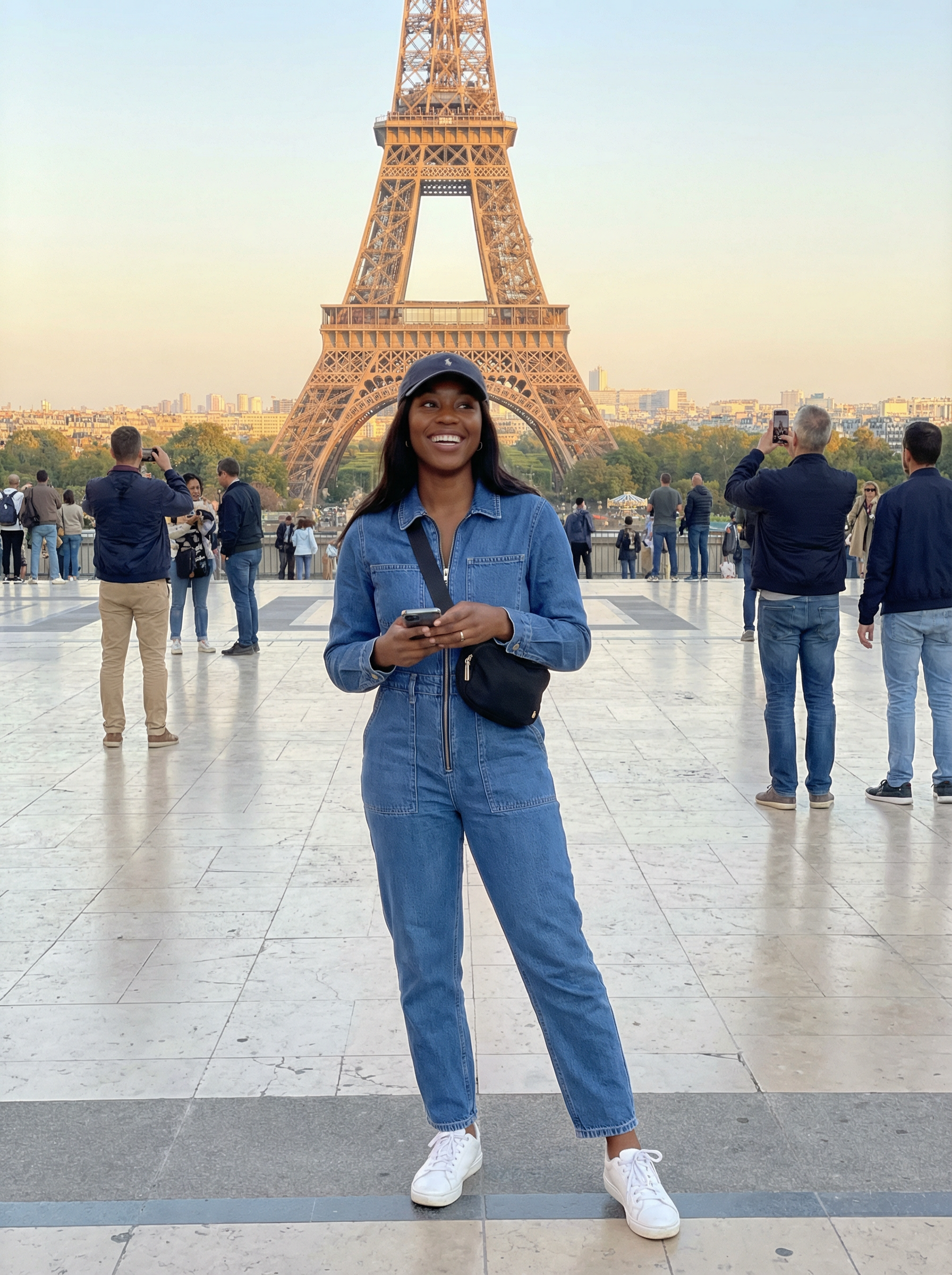 model in trendy jumpsuit, sneakers, baseball cap, fanny pack at Trocadéro with Eiffel Tower view, popular photo spot, tourists around, perfect Instagram moment, golden hour lighting, iconic Paris backdrop
