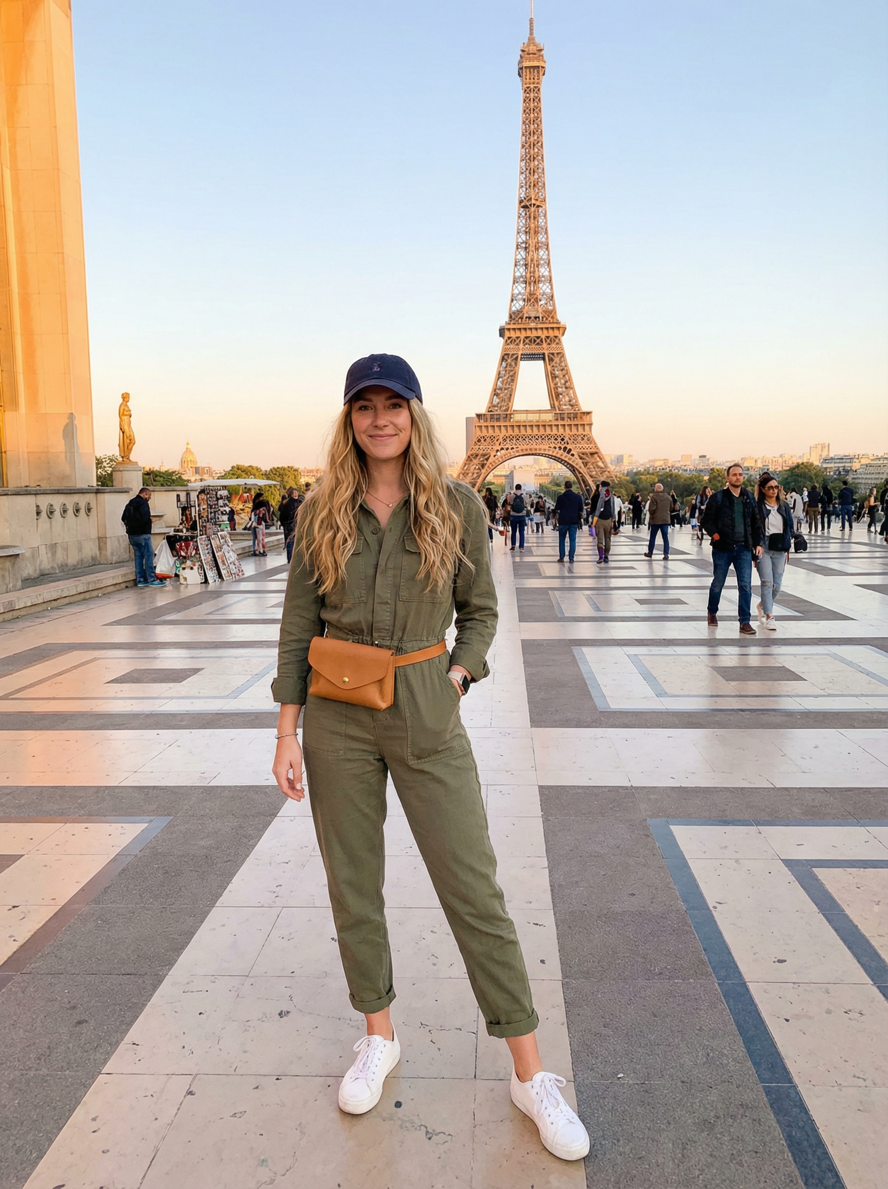 model in trendy jumpsuit, sneakers, baseball cap, fanny pack at Trocadéro with Eiffel Tower view, popular photo spot, tourists around, perfect Instagram moment, golden hour lighting, iconic Paris backdrop