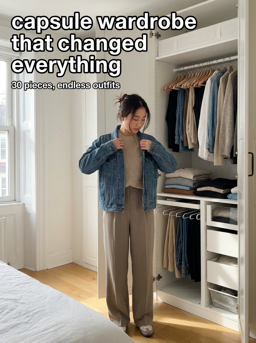 model in trendy outfit in bedroom with organized closet, trying on clothes, natural lighting. TikTok TikTok-style text overlay with white text with black outline: "capsule wardrobe that changed everything" smaller text: "(30 pieces, endless outfits)" , do not show tiktok interface or logo