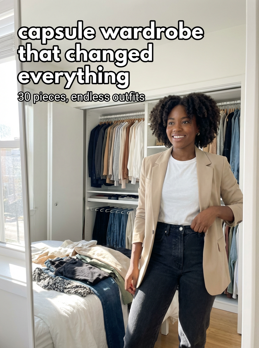model in trendy outfit in bedroom with organized closet, trying on clothes, natural lighting. TikTok-style text overlay with white text with black outline: "capsule wardrobe that changed everything" smaller text: "(30 pieces, endless outfits)" , do not show tiktok interface or logo
