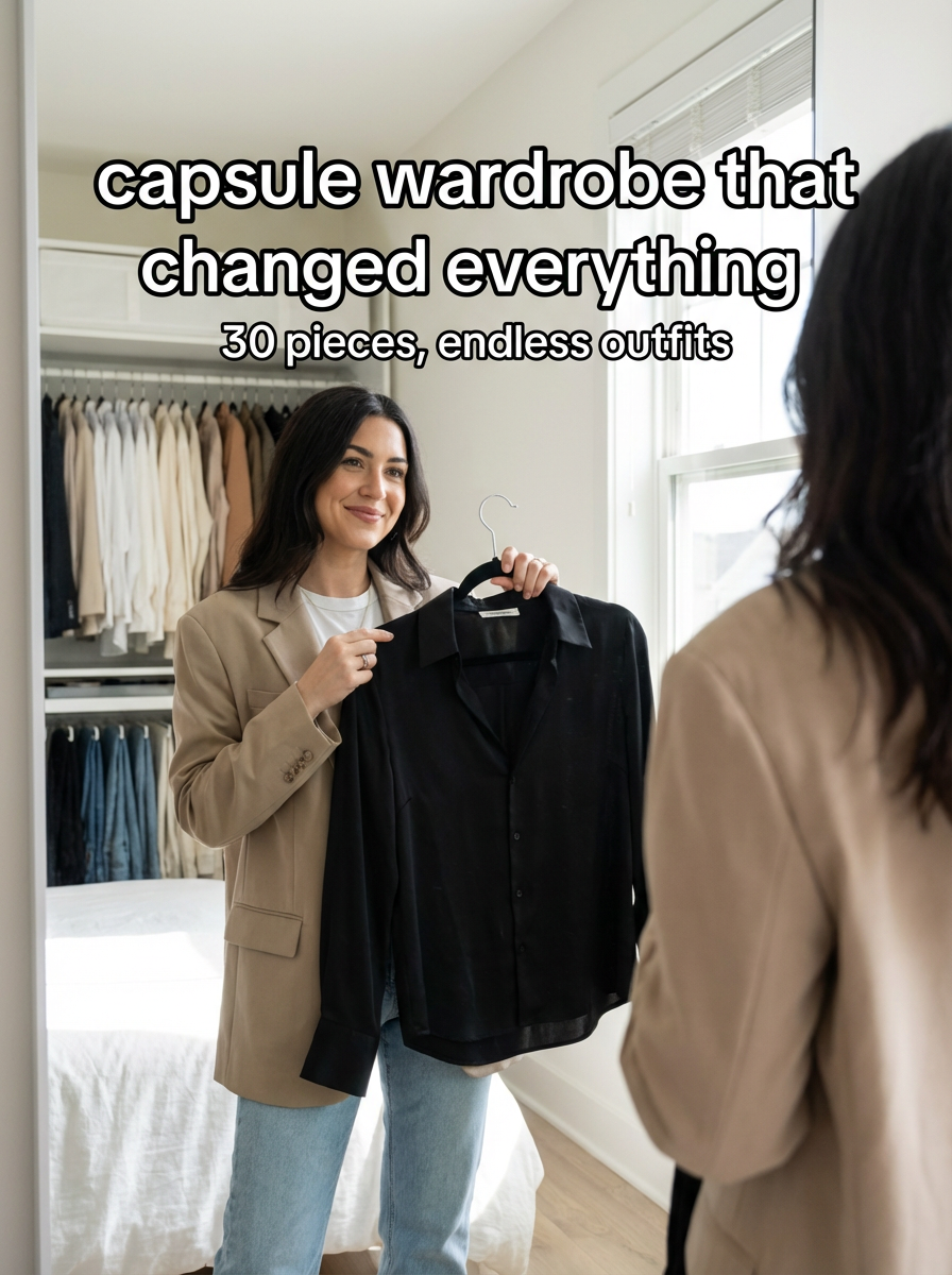 model in trendy outfit in bedroom with organized closet, trying on clothes, natural lighting. TikTok-style text overlay with white text with black outline: "capsule wardrobe that changed everything" smaller text: "(30 pieces, endless outfits)" , do not show tiktok interface or logo