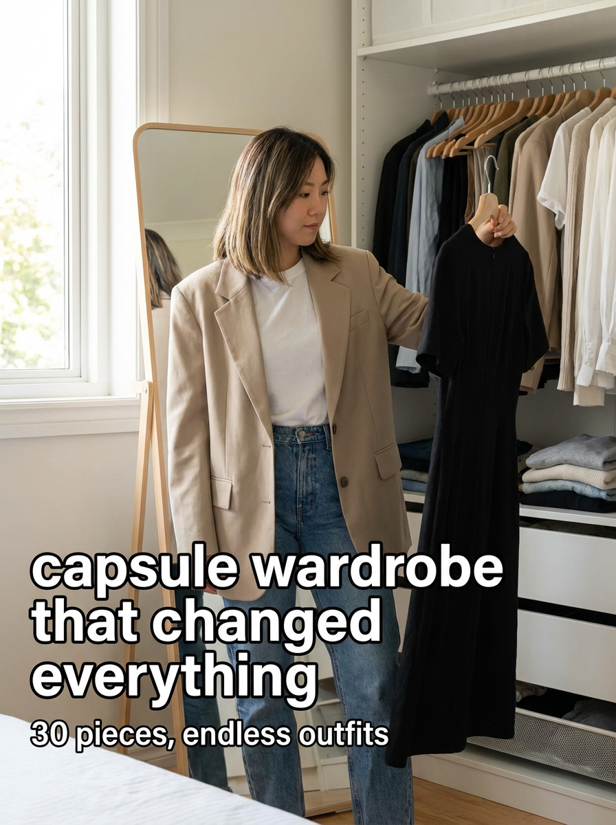 model in trendy outfit in bedroom with organized closet, trying on clothes, natural lighting. TikTok-style text overlay with white text with black outline: "capsule wardrobe that changed everything" smaller text: "(30 pieces, endless outfits)" , do not show tiktok interface or logo