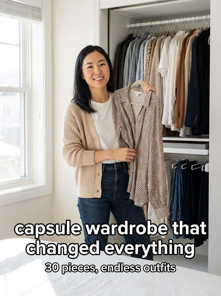 model in trendy outfit in bedroom with organized closet, trying on clothes, natural lighting. TikTok-style text overlay with white text with black outline: "capsule wardrobe that changed everything" smaller text: "(30 pieces, endless outfits)" , do not show tiktok interface or logo