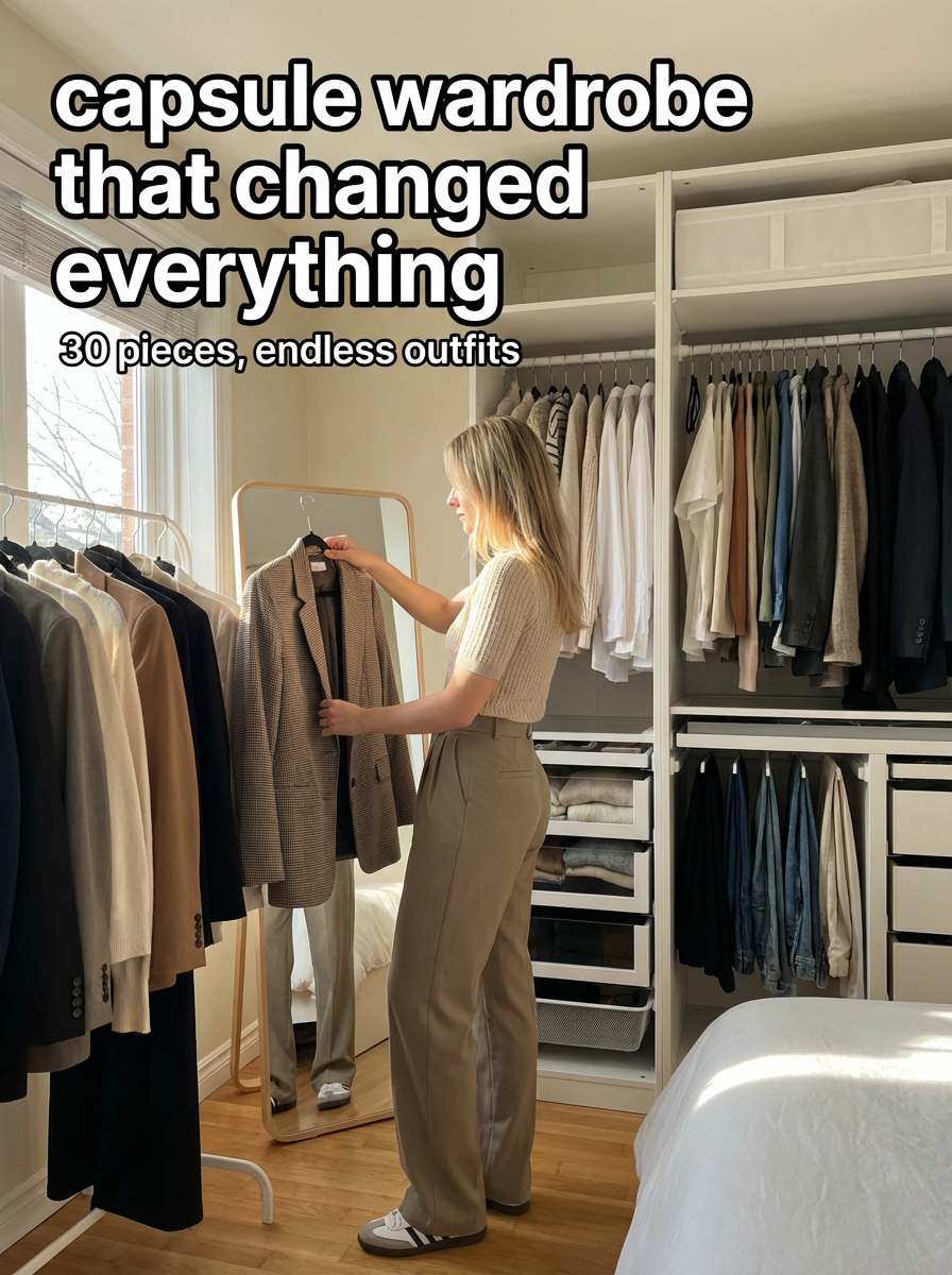 model in trendy outfit in bedroom with organized closet, trying on clothes, natural lighting. TikTok-style text overlay with white text with black outline: "capsule wardrobe that changed everything" smaller text: "(30 pieces, endless outfits)" , do not show tiktok interface or logo