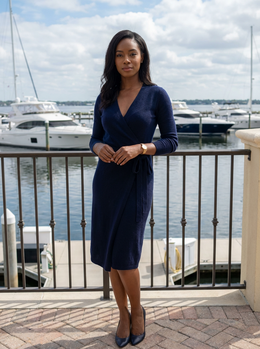 model in understated elegant attire, navy cashmere, gold watch only accessory, yacht or country club background