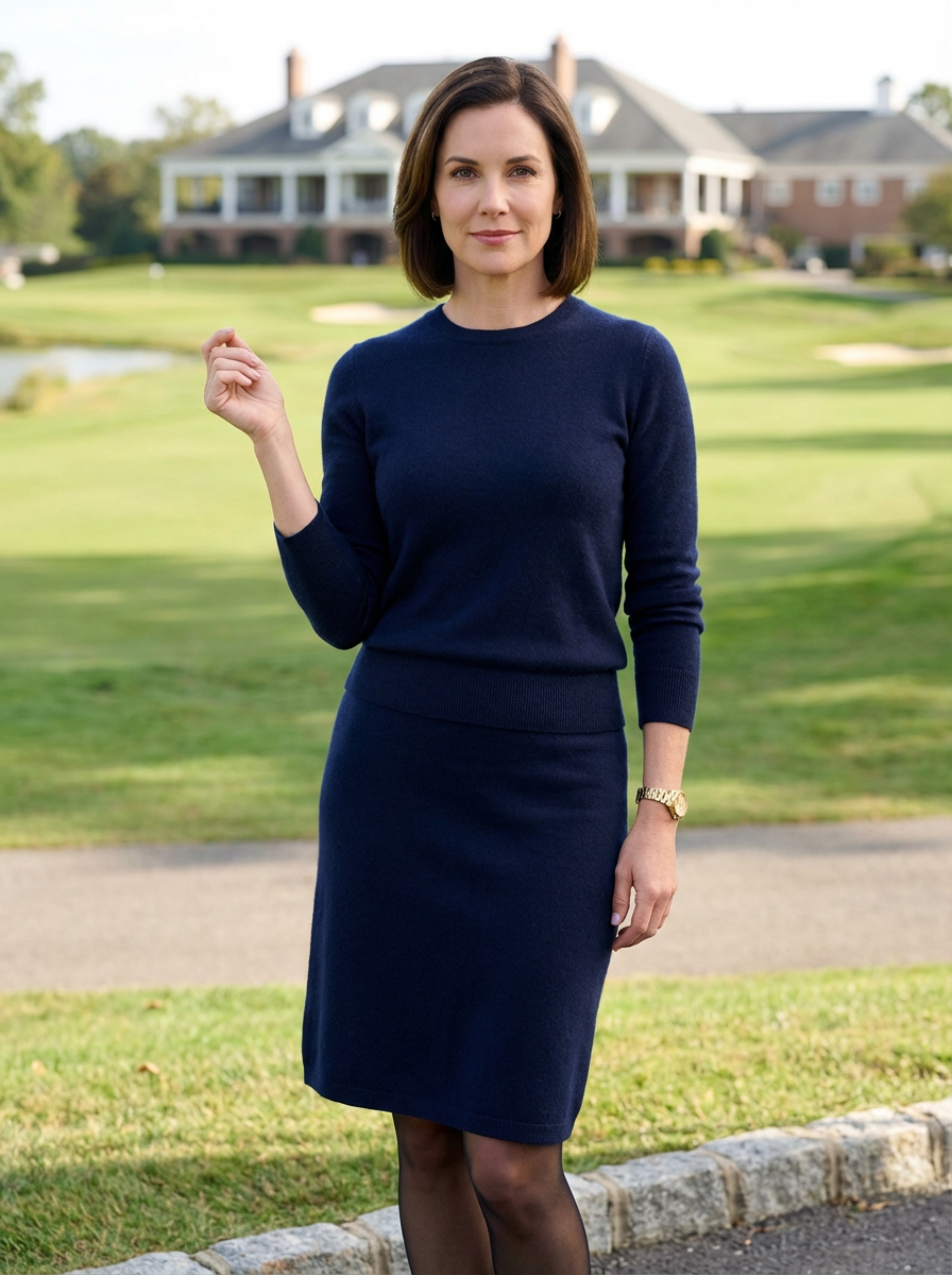 model in understated elegant attire, navy cashmere, gold watch only accessory, yacht or country club background