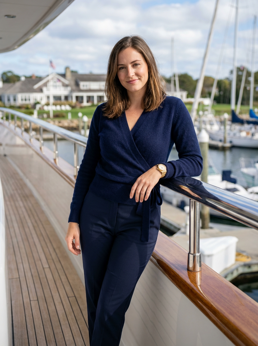 model in understated elegant attire, navy cashmere, gold watch only accessory, yacht or country club background