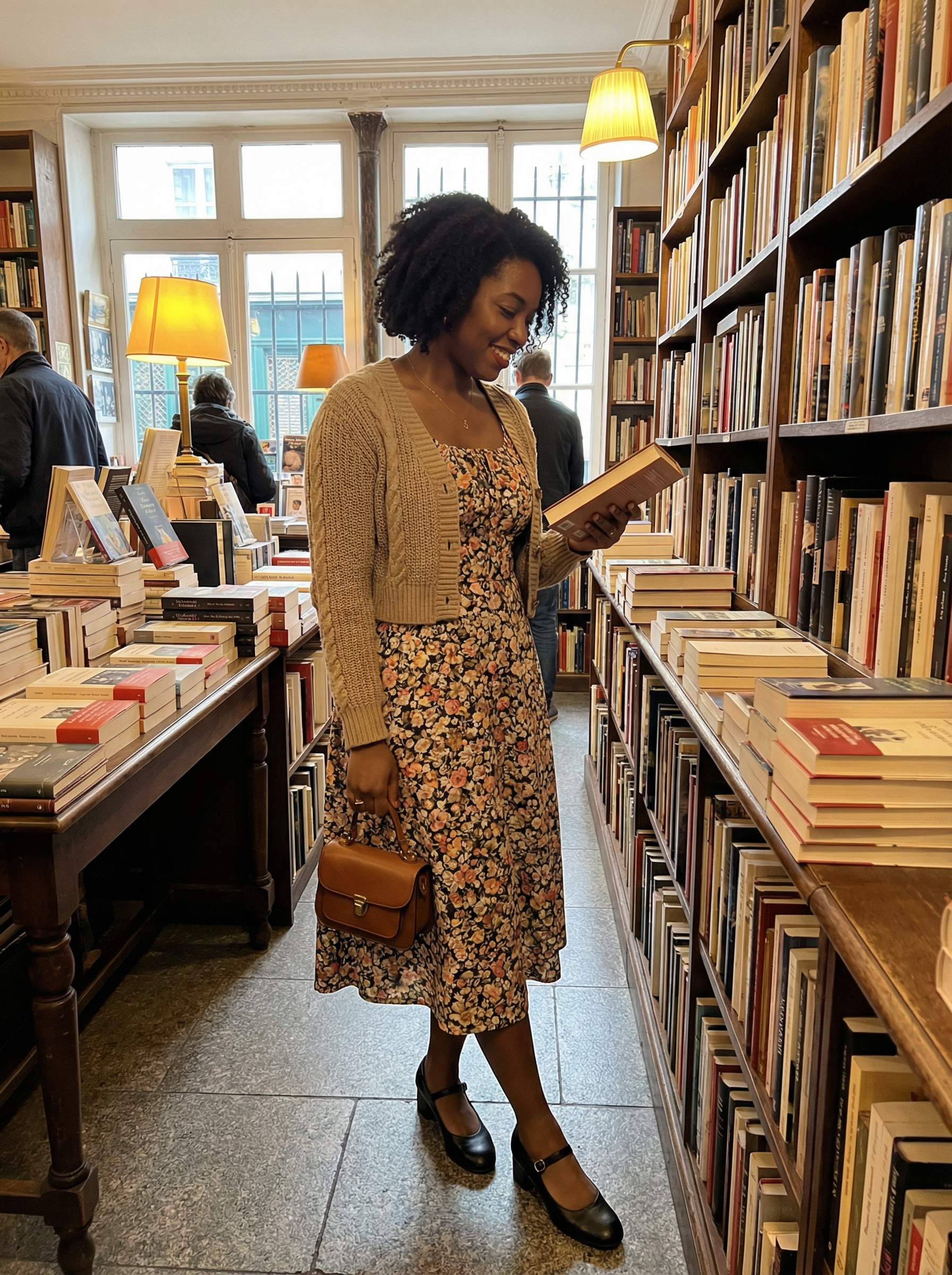 model in vintage-inspired dress, cropped jacket, mary jane shoes, small purse browsing books at Shakespeare and Company bookstore, cozy literary atmosphere, stacked books everywhere, warm indoor lighting, intellectual Parisian charm