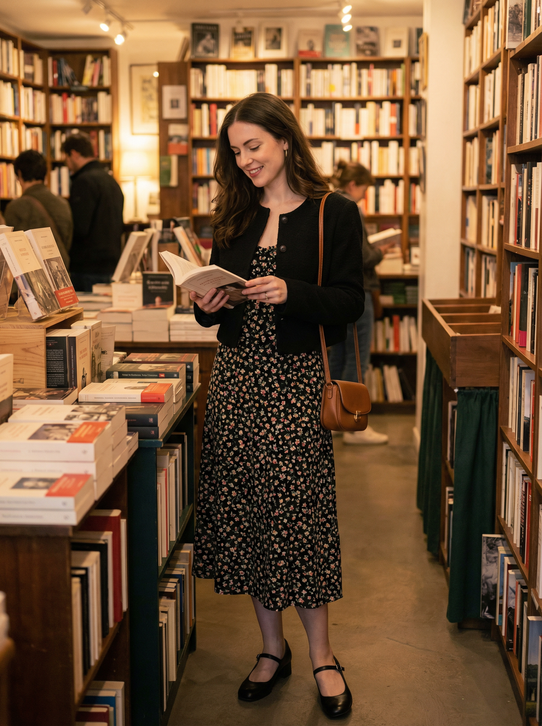 model in vintage-inspired dress, cropped jacket, mary jane shoes, small purse browsing books at Shakespeare and Company bookstore, cozy literary atmosphere, stacked books everywhere, warm indoor lighting, intellectual Parisian charm