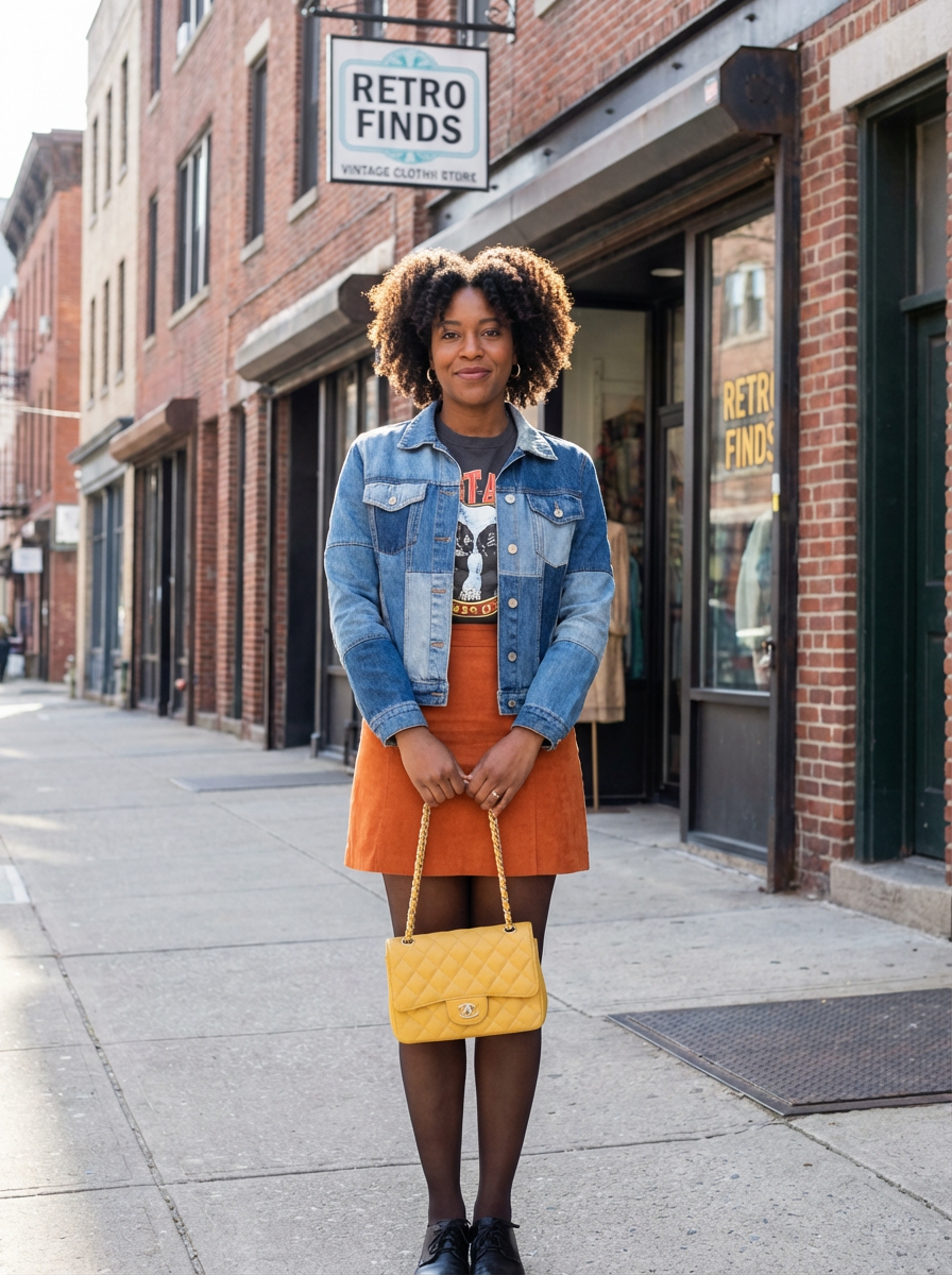 model in vintage or retro styled outfit, eclectic personal style, interesting location