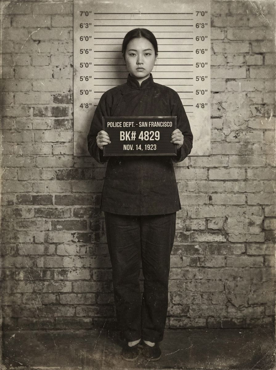 model in vintage style mugshot, black and white aesthetic, old fashioned booking photo, serious demeanor