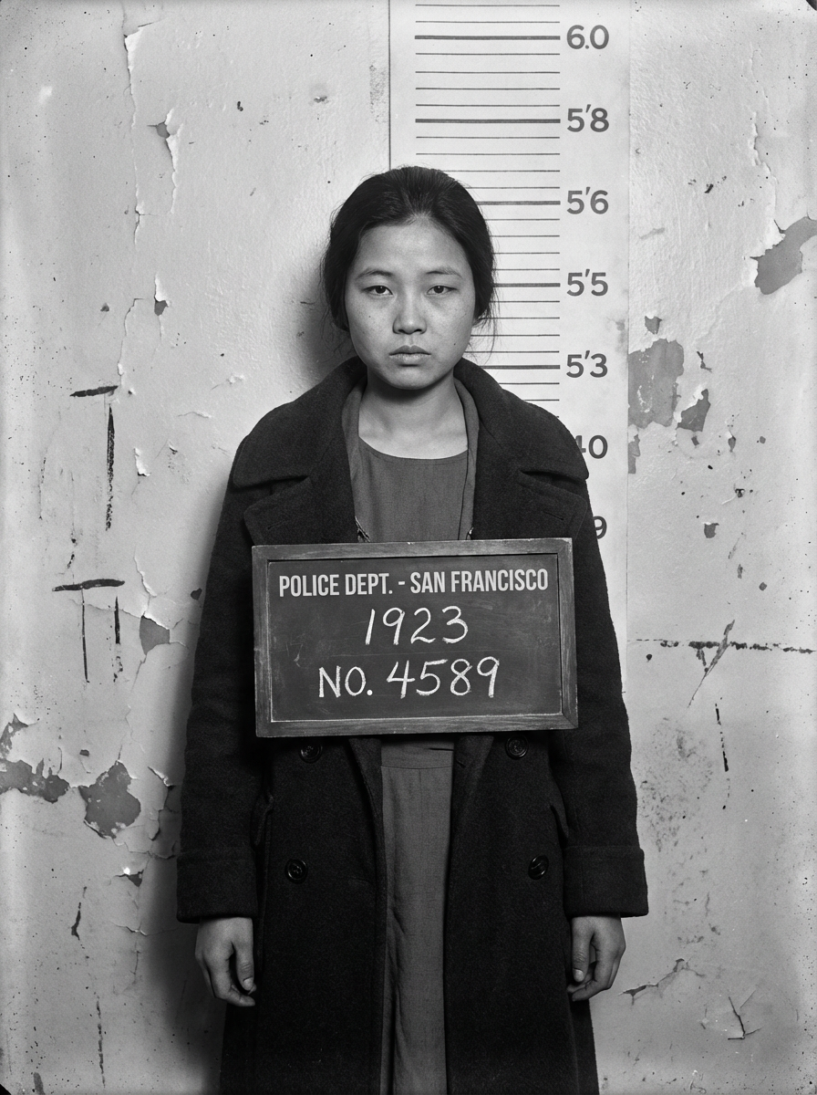model in vintage style mugshot, black and white aesthetic, old fashioned booking photo, serious demeanor