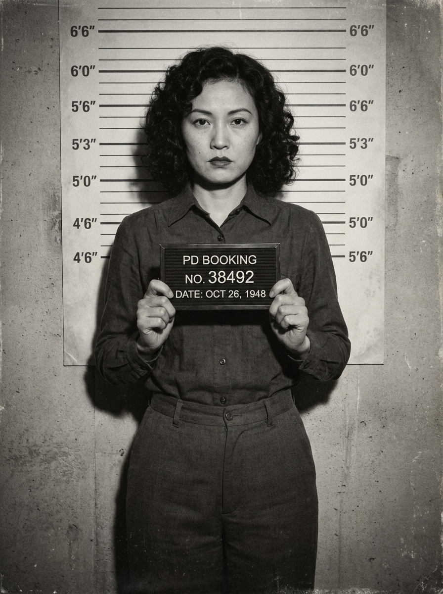 model in vintage style mugshot, black and white aesthetic, old fashioned booking photo, serious demeanor