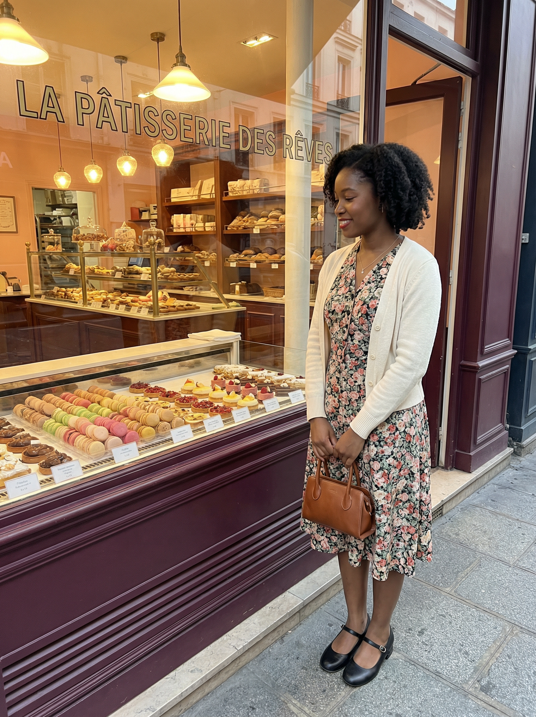 model in vintage tea dress, cardigan, mary janes, small handbag at traditional patisserie window display, colorful macarons and pastries, charming bakery setting, sweet Parisian indulgence, warm bakery lighting, culinary culture