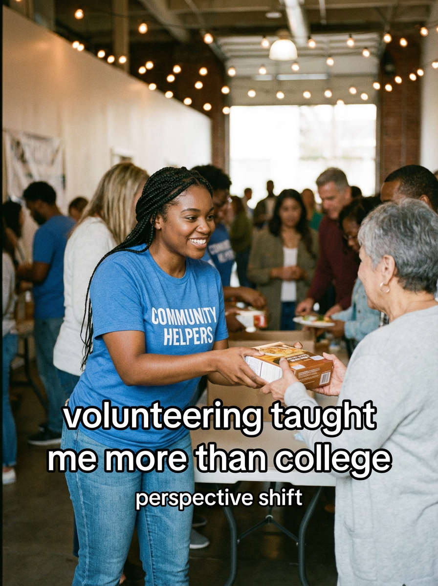 model in volunteer outfit at community center or charity event, helping others, warm community lighting. TikTok-style text overlay with white text with black outline: "volunteering taught me more than college" smaller text: "(perspective shift)" , do not show tiktok interface or logo