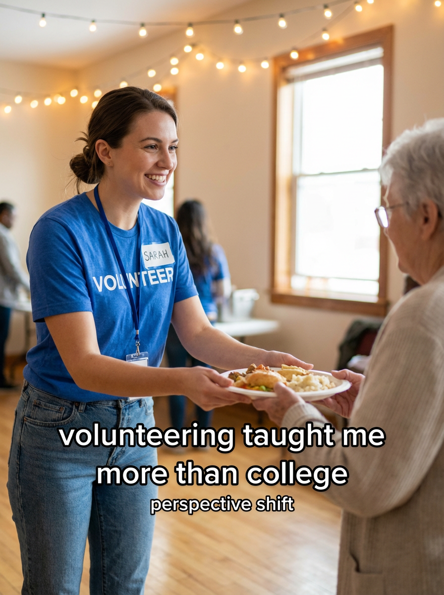 model in volunteer outfit at community center or charity event, helping others, warm community lighting. TikTok-style text overlay with white text with black outline: "volunteering taught me more than college" smaller text: "(perspective shift)" , do not show tiktok interface or logo