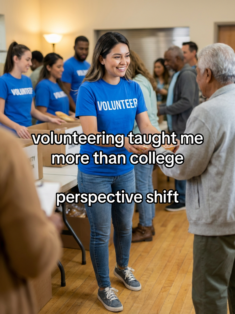 model in volunteer outfit at community center or charity event, helping others, warm community lighting. TikTok-style text overlay with white text with black outline: "volunteering taught me more than college" smaller text: "(perspective shift)" , do not show tiktok interface or logo