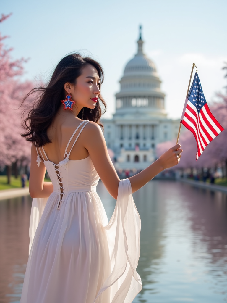 model in Washington DC during cherry blossom season, wearing a flowing white dress with bold red and blue star accessories , holding a small American flag, the Washington Monument and Capitol building creating a picturesque patriotic backdrop