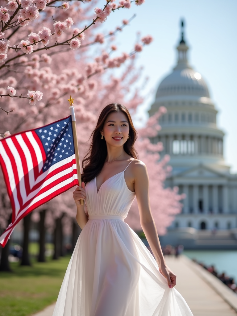 model in Washington DC during cherry blossom season, wearing a flowing white dress with bold red and blue star accessories , holding a small American flag, the Washington Monument and Capitol building creating a picturesque patriotic backdrop