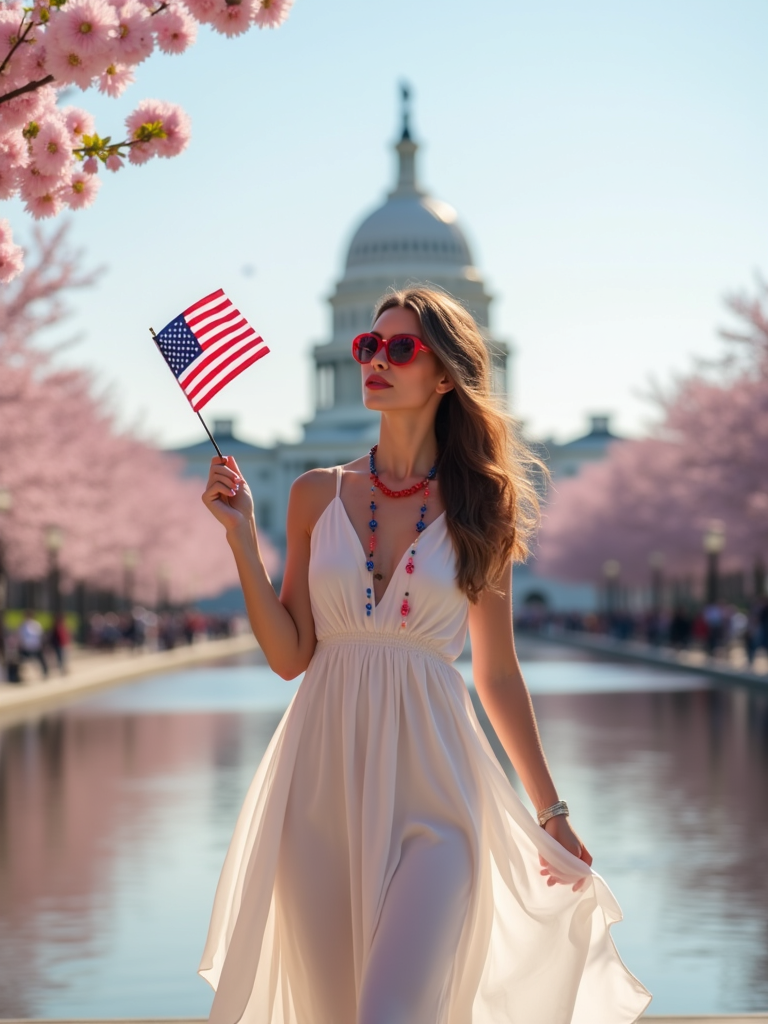 model in Washington DC during cherry blossom season, wearing a flowing white dress with bold red and blue star accessories , holding a small American flag, the Washington Monument and Capitol building creating a picturesque patriotic backdrop