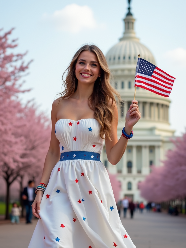 model in Washington DC during cherry blossom season, wearing a flowing white dress with bold red and blue star accessories , holding a small American flag, the Washington Monument and Capitol building creating a picturesque patriotic backdrop