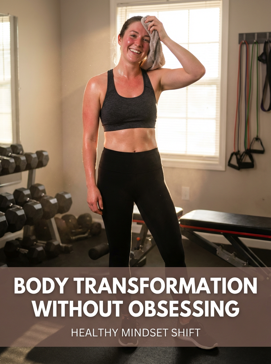 model in workout clothes in home gym setup, weights and equipment visible, post-workout glow, motivational lighting. TikTok text overlay: "body transformation without obsessing" smaller text: "(healthy mindset shift)" , do not show tiktok interface