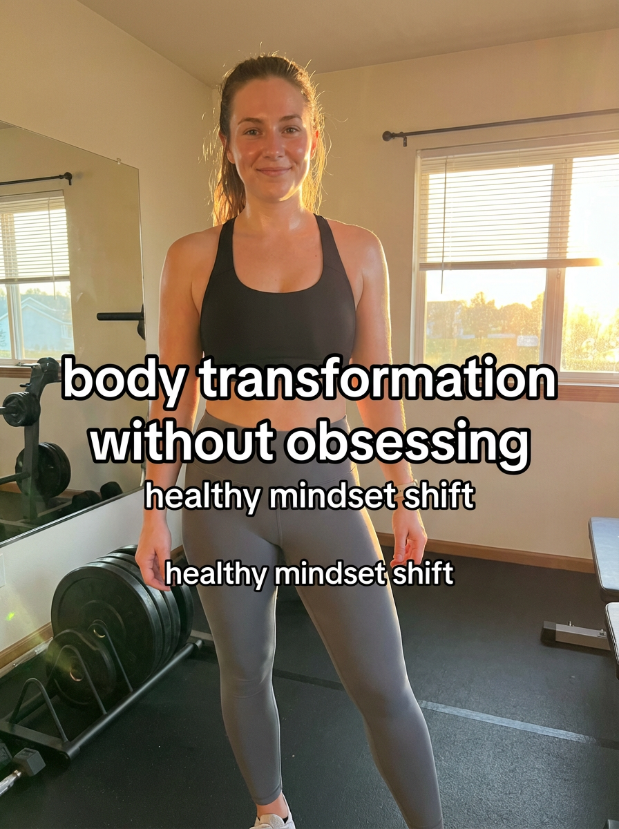 model in workout clothes in home gym setup, weights and equipment visible, post-workout glow, motivational lighting. TikTok TikTok-style text overlay with white text with black outline: "body transformation without obsessing" smaller text: "(healthy mindset shift)" , do not show tiktok interface or logo