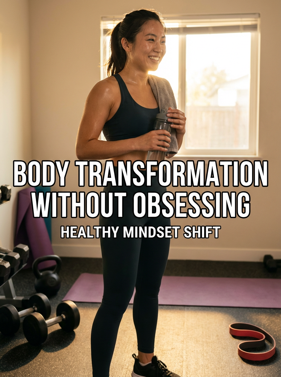 model in workout clothes in home gym setup, weights and equipment visible, post-workout glow, motivational lighting. TikTok TikTok-style text overlay with white text with black outline: "body transformation without obsessing" smaller text: "(healthy mindset shift)" , do not show tiktok interface or logo