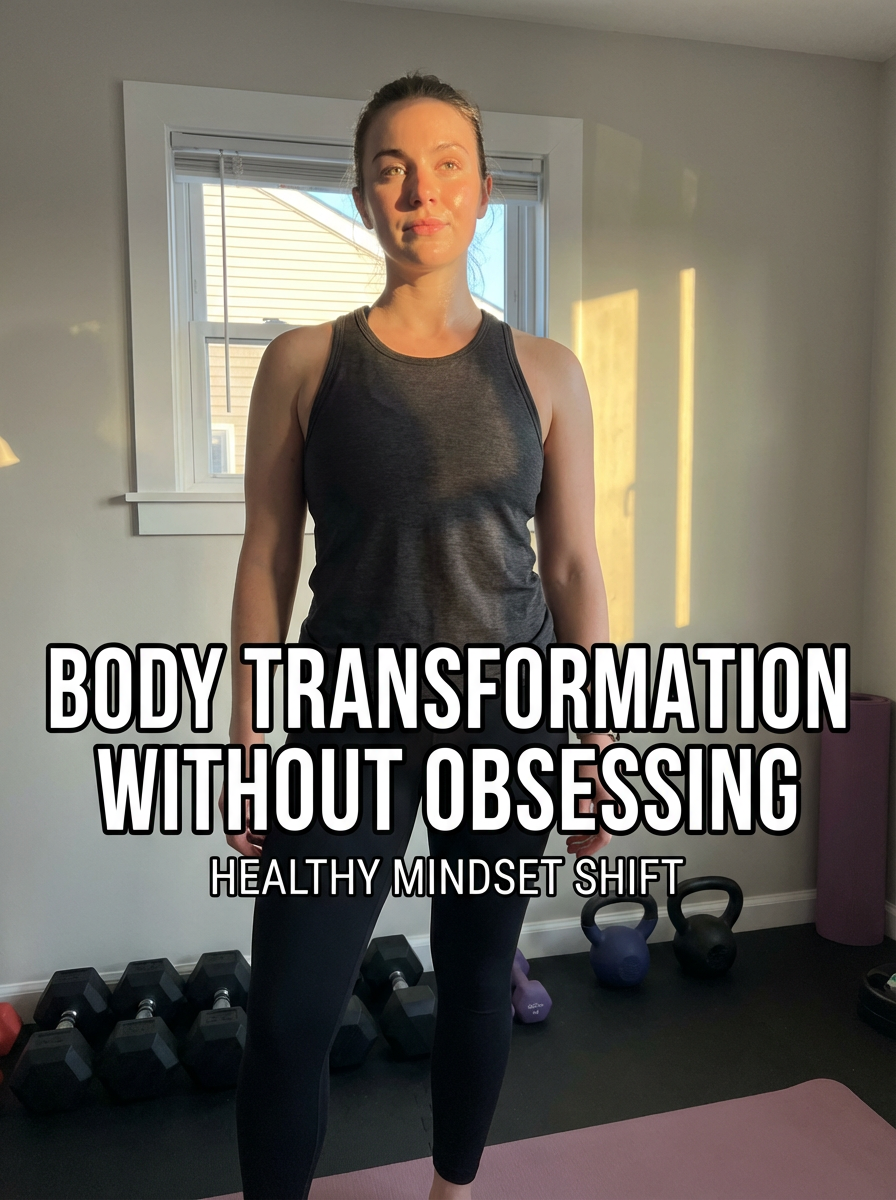 model in workout clothes in home gym setup, weights and equipment visible, post-workout glow, motivational lighting. TikTok-style text overlay with white text with black outline: "body transformation without obsessing" smaller text: "(healthy mindset shift)" , do not show tiktok interface or logo