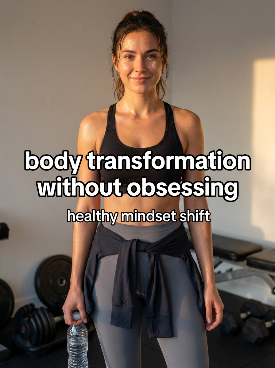 model in workout clothes in home gym setup, weights and equipment visible, post-workout glow, motivational lighting. TikTok-style text overlay with white text with black outline: "body transformation without obsessing" smaller text: "(healthy mindset shift)" , do not show tiktok interface or logo