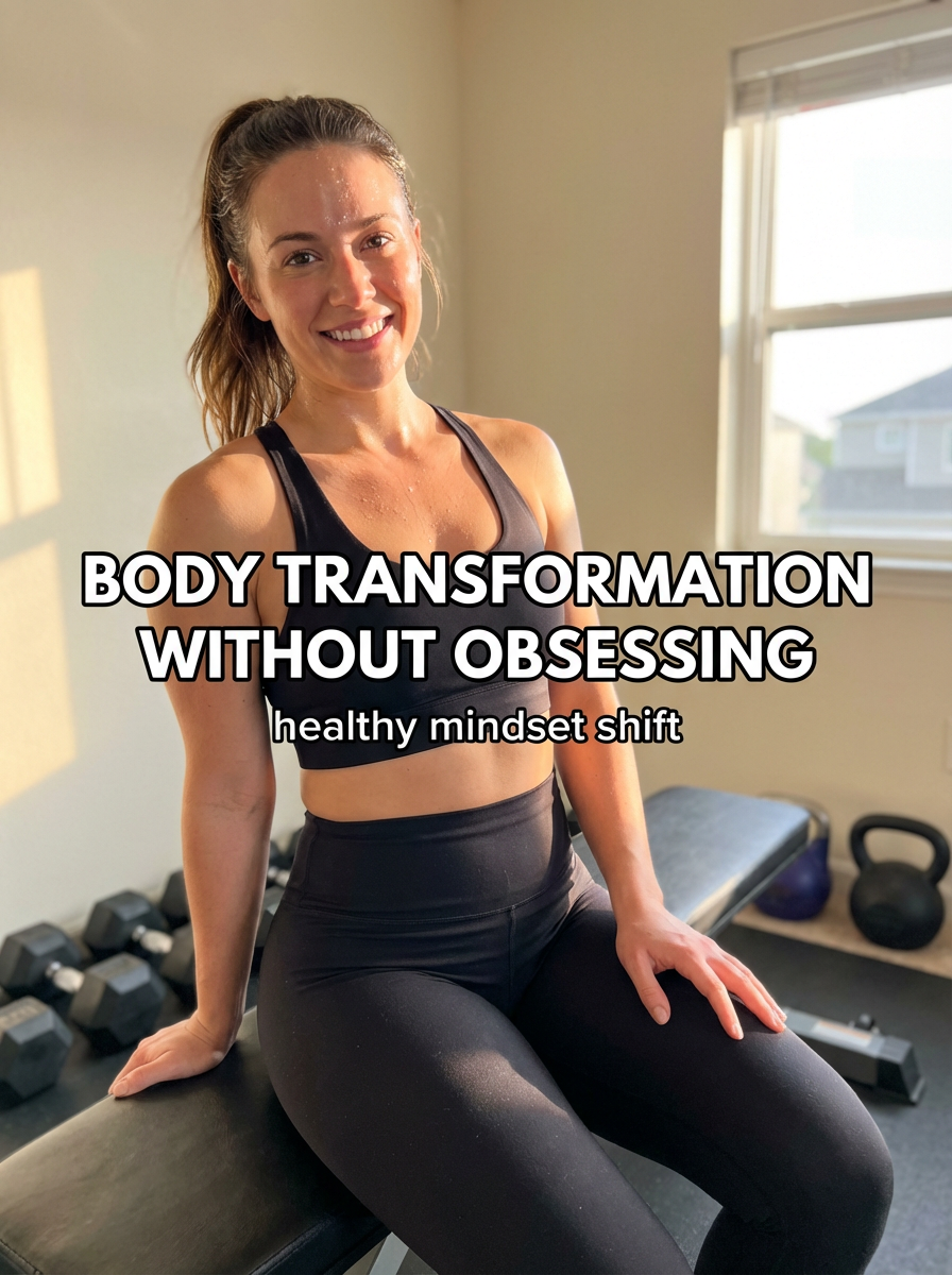 model in workout clothes in home gym setup, weights and equipment visible, post-workout glow, motivational lighting. TikTok-style text overlay with white text with black outline: "body transformation without obsessing" smaller text: "(healthy mindset shift)" , do not show tiktok interface or logo