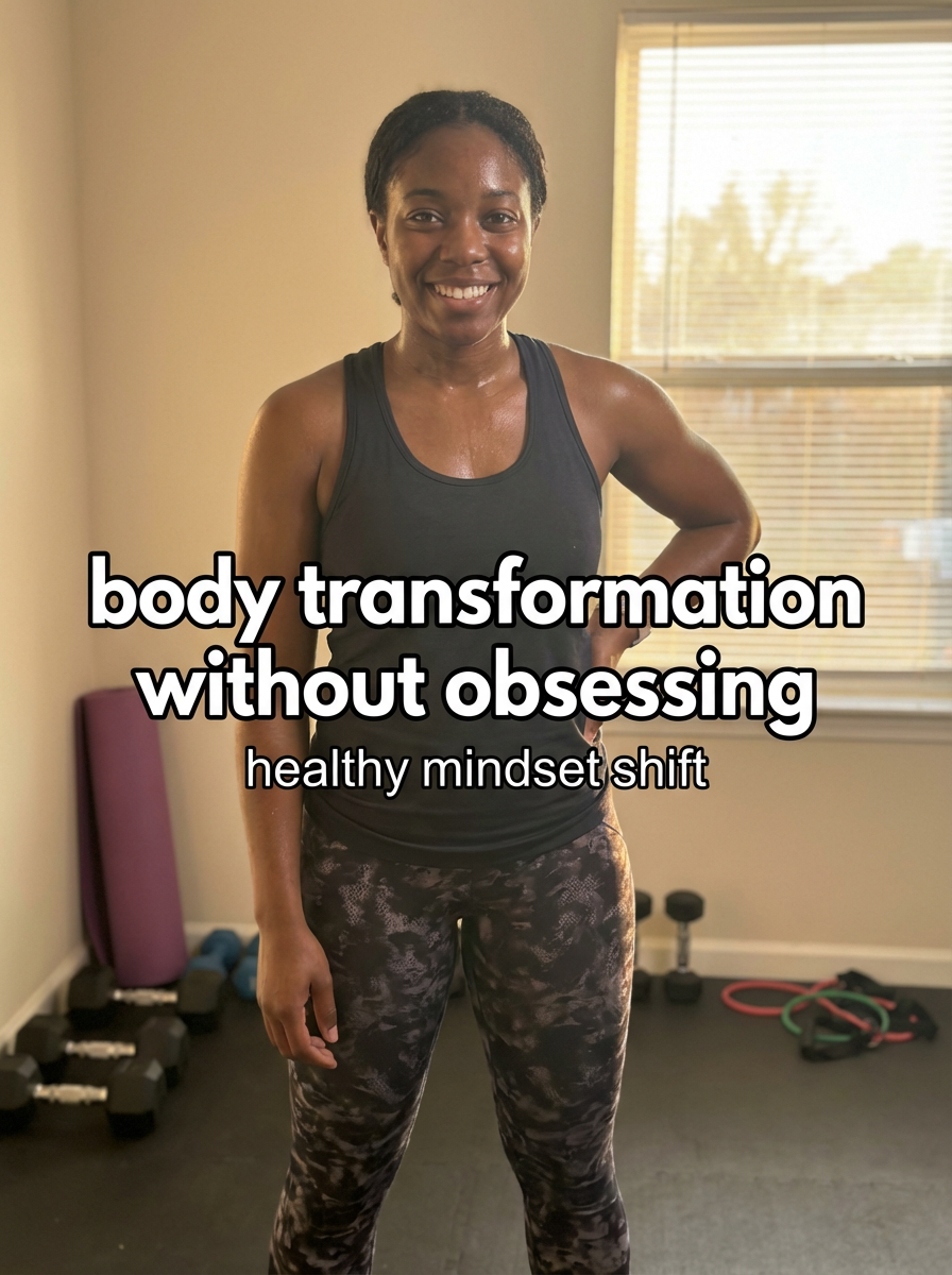 model in workout clothes in home gym setup, weights and equipment visible, post-workout glow, motivational lighting. TikTok-style text overlay with white text with black outline: "body transformation without obsessing" smaller text: "(healthy mindset shift)" , do not show tiktok interface or logo