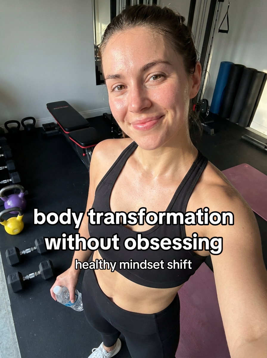 model in workout clothes in home gym setup, weights and equipment visible, post-workout glow, motivational lighting. TikTok-style text overlay with white text with black outline: "body transformation without obsessing" smaller text: "(healthy mindset shift)" , do not show tiktok interface or logo
