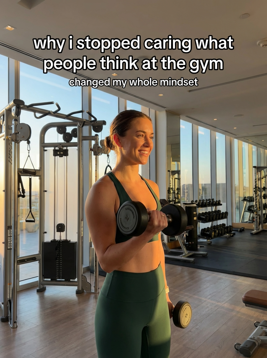 model in workout set and sports bra at luxury gym, golden hour lighting streaming through floor-to-ceiling windows, modern equipment in background, confident pose mid-workout. TikTok text overlay: "why i stopped caring what people think at the gym" smaller text: "(changed my whole mindset)" , do not show tiktok interface
