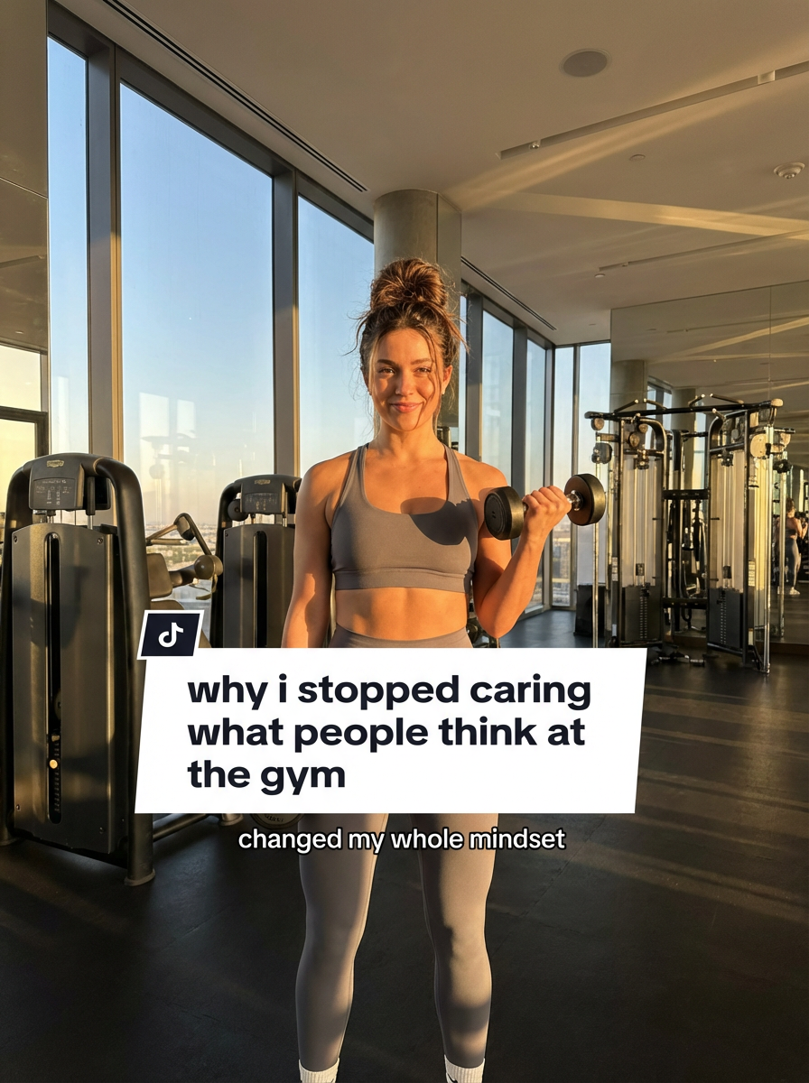 model in workout set and sports bra at luxury gym, golden hour lighting streaming through floor-to-ceiling windows, modern equipment in background, confident pose mid-workout. TikTok text overlay: "why i stopped caring what people think at the gym" smaller text: "(changed my whole mindset)" , do not show tiktok interface