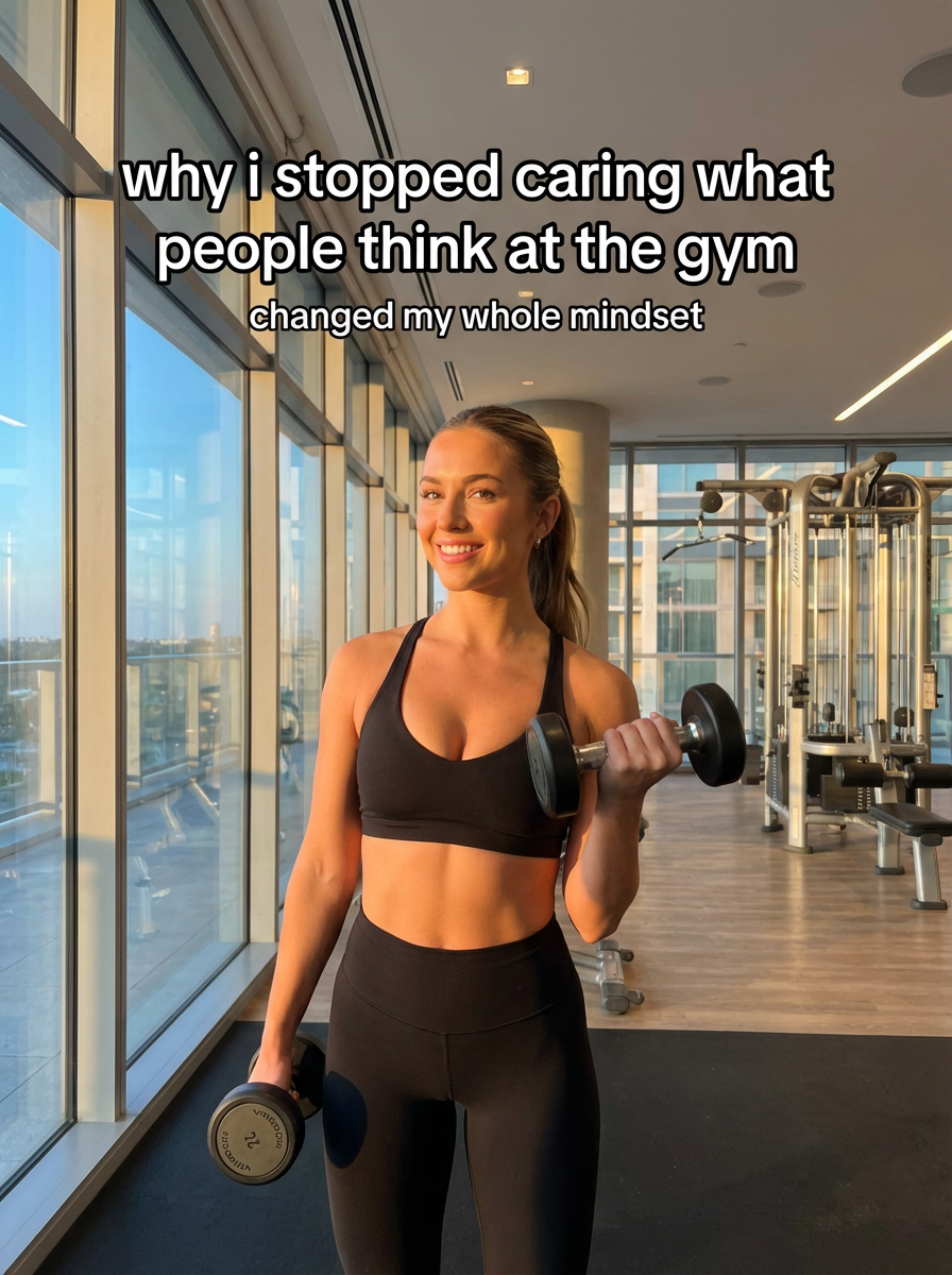 model in workout set and sports bra at luxury gym, golden hour lighting streaming through floor-to-ceiling windows, modern equipment in background, confident pose mid-workout. TikTok-style text overlay with white text with black outline: "why i stopped caring what people think at the gym" smaller text: "(changed my whole mindset)" , do not show tiktok interface or logo