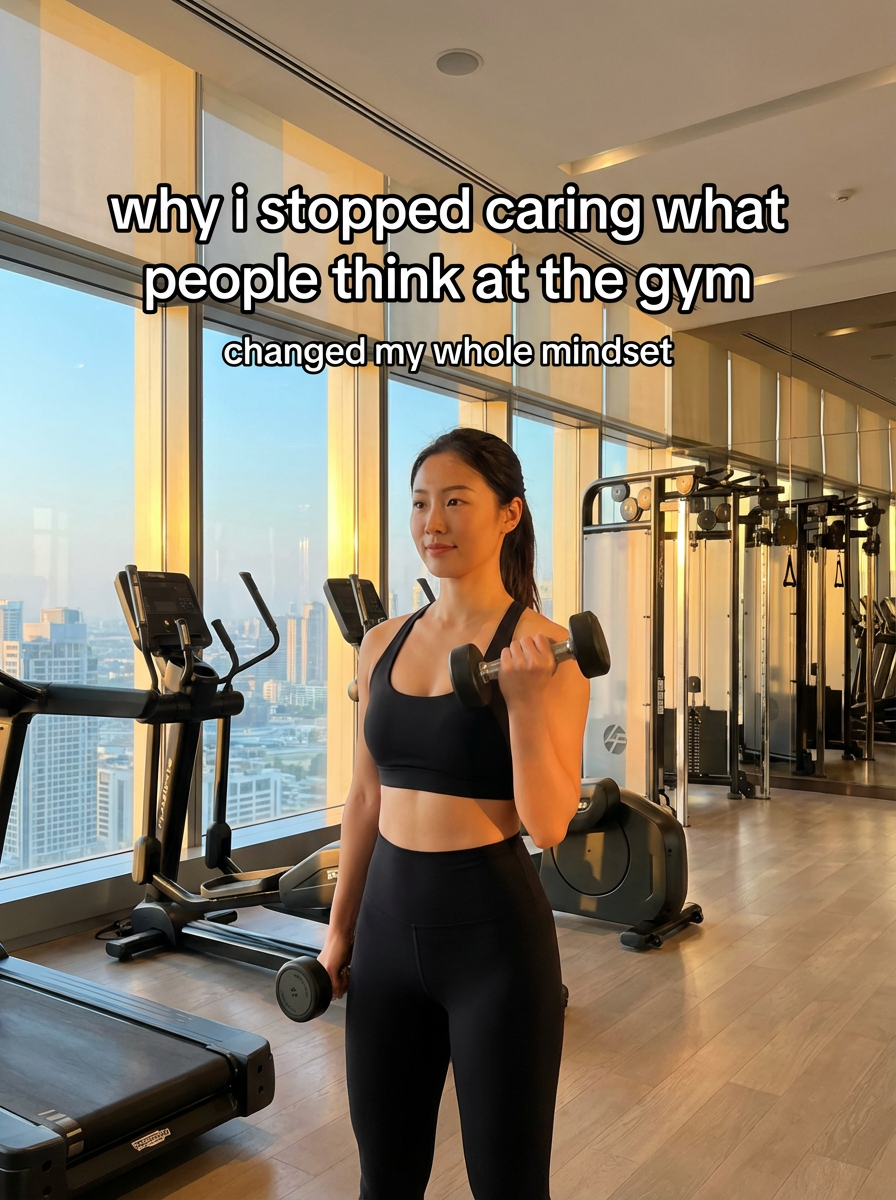 model in workout set and sports bra at luxury gym, golden hour lighting streaming through floor-to-ceiling windows, modern equipment in background, confident pose mid-workout. TikTok-style text overlay with white text with black outline: "why i stopped caring what people think at the gym" smaller text: "(changed my whole mindset)" , do not show tiktok interface or logo