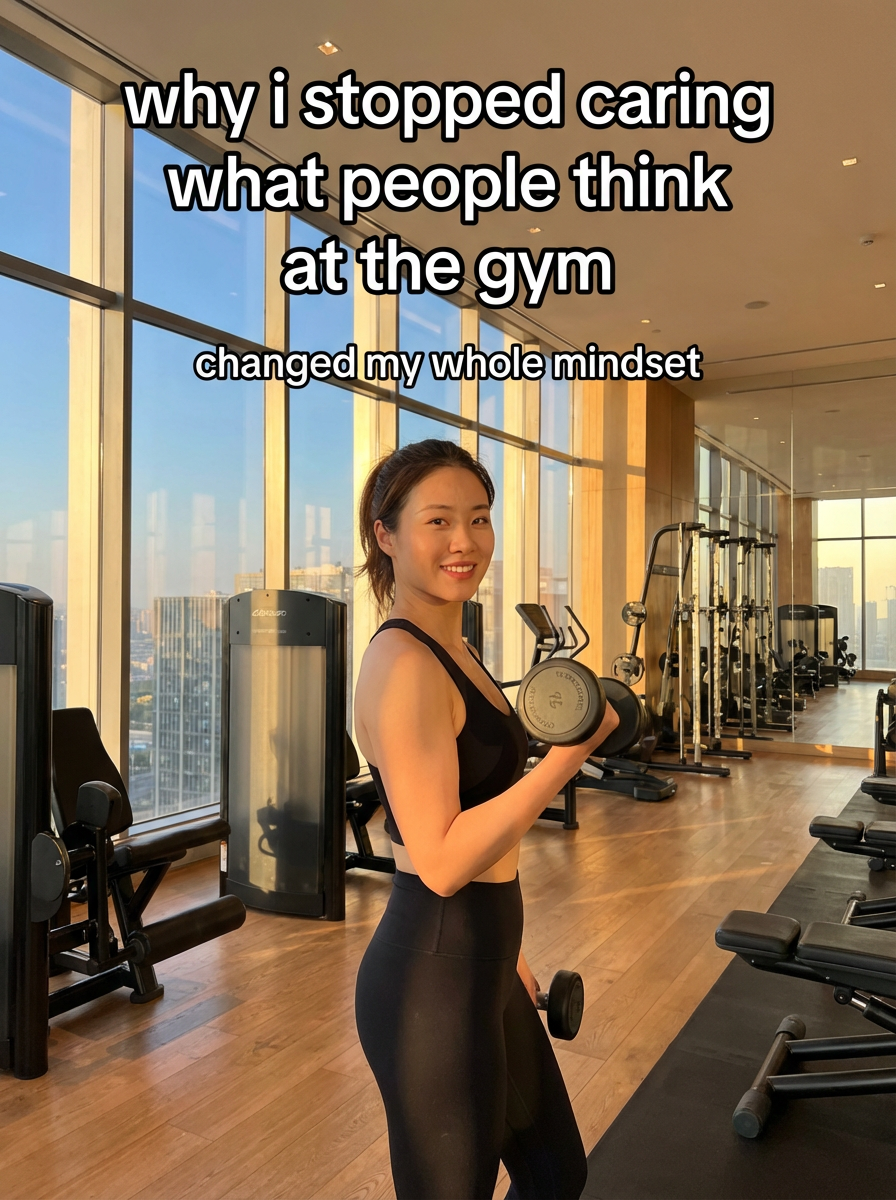 model in workout set and sports bra at luxury gym, golden hour lighting streaming through floor-to-ceiling windows, modern equipment in background, confident pose mid-workout. TikTok-style text overlay with white text with black outline: "why i stopped caring what people think at the gym" smaller text: "(changed my whole mindset)" , do not show tiktok interface or logo