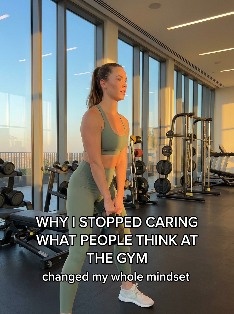 model in workout set and sports bra at luxury gym, golden hour lighting streaming through floor-to-ceiling windows, modern equipment in background, confident pose mid-workout. TikTok-style text overlay with white text with black outline: "why i stopped caring what people think at the gym" smaller text: "(changed my whole mindset)" , do not show tiktok interface or logo