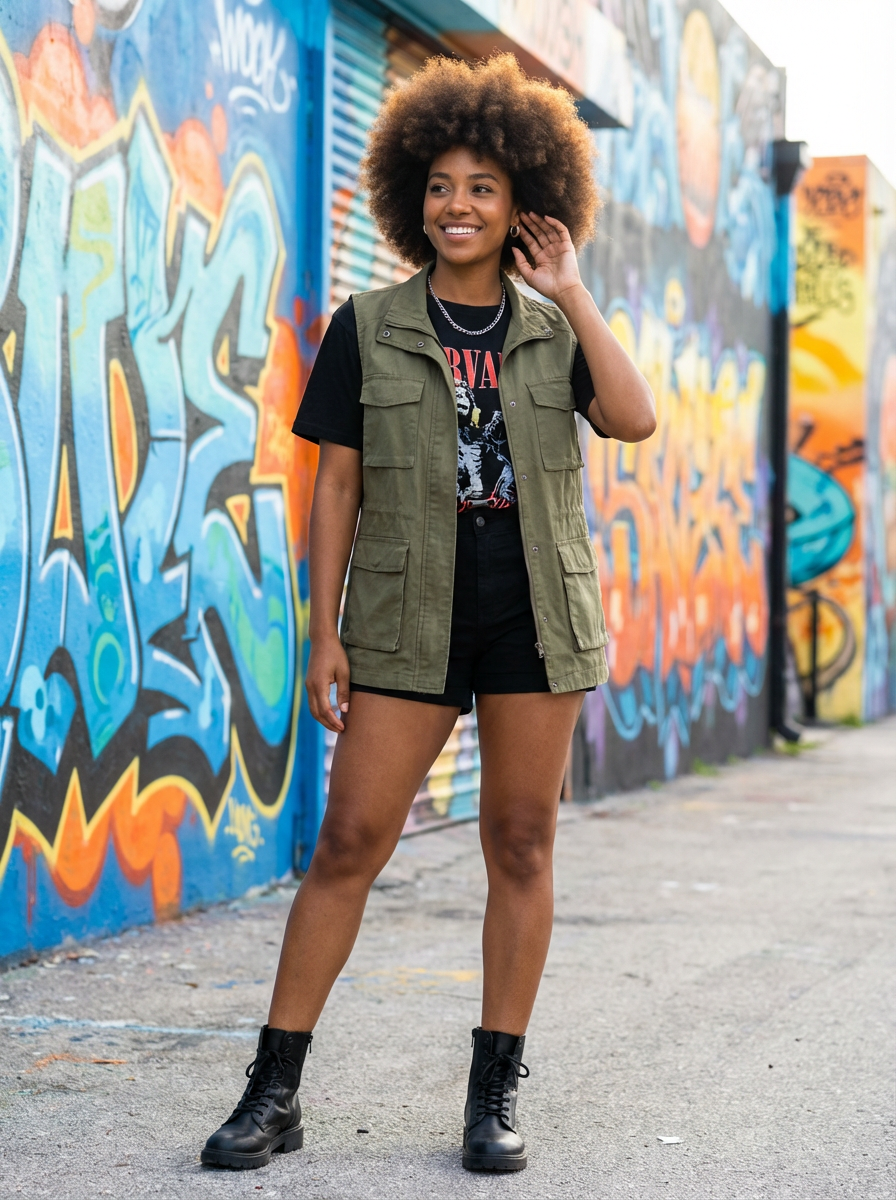 model in Wynwood Walls, colorful street art murals, trendy urban outfit, artistic vibe