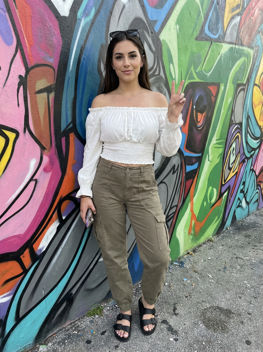 model in Wynwood Walls, colorful street art murals, trendy urban outfit, artistic vibe
