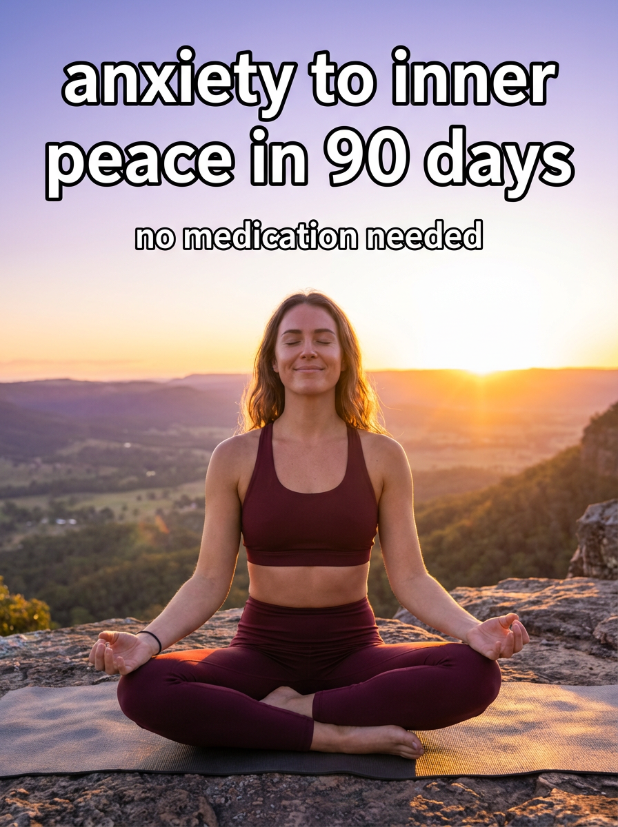 model in yoga outfit in serene outdoor setting, meditation pose, sunrise/sunset lighting, peaceful expression. TikTok-style text overlay with white text with black outline: "anxiety to inner peace in 90 days" smaller text: "(no medication needed)" , do not show tiktok interface or logo