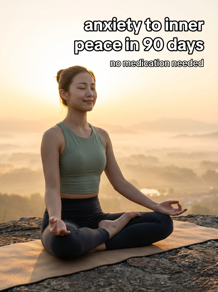 model in yoga outfit in serene outdoor setting, meditation pose, sunrise/sunset lighting, peaceful expression. TikTok-style text overlay with white text with black outline: "anxiety to inner peace in 90 days" smaller text: "(no medication needed)" , do not show tiktok interface or logo