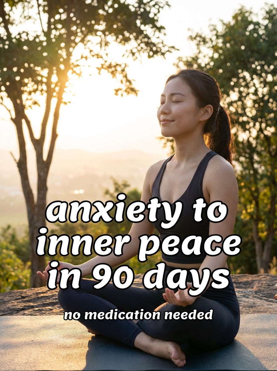 model in yoga outfit in serene outdoor setting, meditation pose, sunrise/sunset lighting, peaceful expression. TikTok-style text overlay with white text with black outline: "anxiety to inner peace in 90 days" smaller text: "(no medication needed)" , do not show tiktok interface or logo